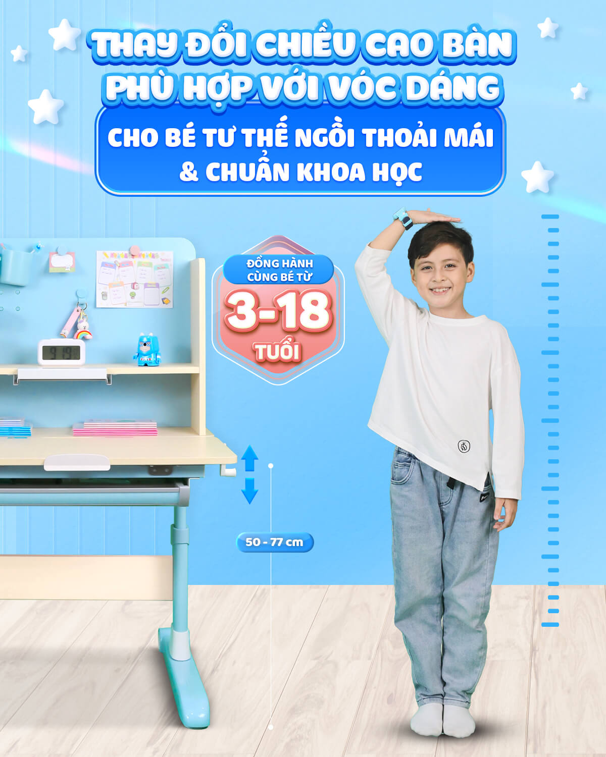 + Điều Chỉnh Chiều Cao: Tất cả các mẫu bàn học Chilux đều có khả năng điều chỉnh chiều cao của chân bàn, cho phép mặt bàn linh hoạt điều chỉnh từ 53cm đến 77cm so với mặt đất. Kết hợp với ghế có thể điều chỉnh từ 35-56cm, sản phẩm phù hợp với nhiều độ tuổi của bé, giúp bé ngồi học đúng tư thế.