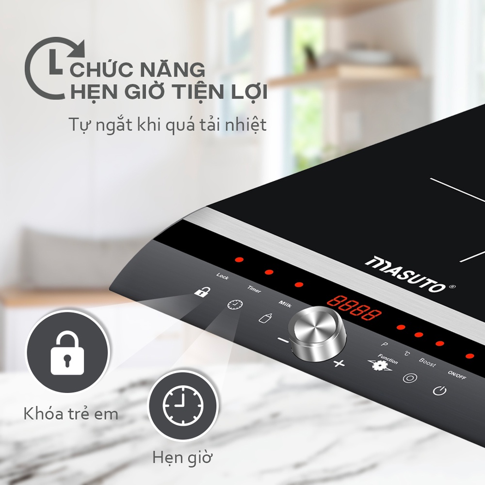 Mặt bếp Masuto Ms-ID2000 phủ kính cường lực Crytal glass cao cấp, dễ dàng làm sạch, chống trầy xước. Đặc biệt, mặt bếp có khả năng chịu được nhiệt độ lên đến 800 độ C, chịu va chạm tốt - hạn chế nứt vỡ, giúp bạn yên tâm nấu nướng. Thân bếp siêu mỏng chỉ 4.2cm nhưng có thể chịu tải là 25kg cho bạn thoải mái nấu nhiều món ăn cho gia đình đông thành viên. Mâm nhiệt cấu tạo kép đôi cho công suất bếp đạt tối đa 2.000W nhanh chóng làm chín thực phẩm.