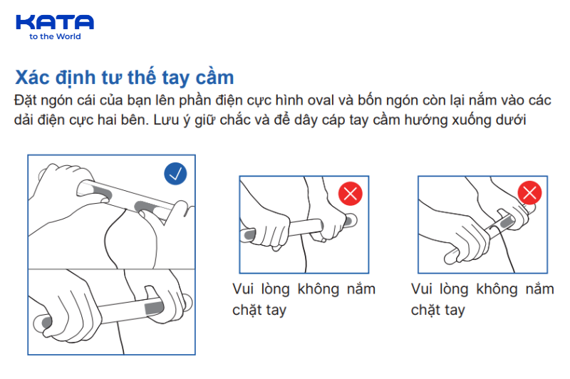 Đối với phần tay cầm, bạn đặt 2 ngón cái lên phần điện cực hình oval và bốn ngón còn lại nắm vào 2 dải điện cực hai bên. Khi đo trên cân, cần giữ tay ở vị trí ngang vùng thắt lưng, hai cánh tay luôn thẳng, tránh giơ quá cao hoặc quá thấp.