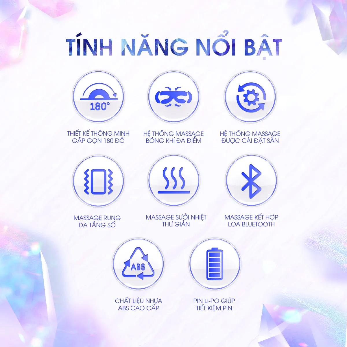 Đây là hệ thống massage thông minh sử dụng bóng khí đa điểm, với 8 điểm tiếp xúc tương ứng với 8 huyệt đạo trên vùng mắt, từ đó thực hiện các động tác massage với lực động học ở mức tối ưu 60Kpa, giúp các nhóm cơ ở khu vực mắt được thư giãn sâu nhất.