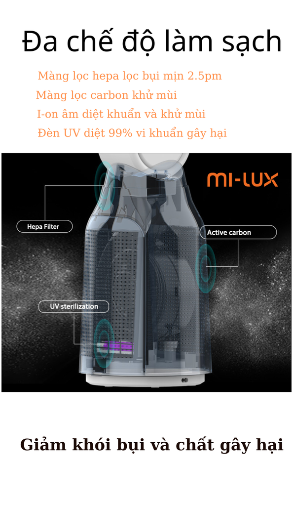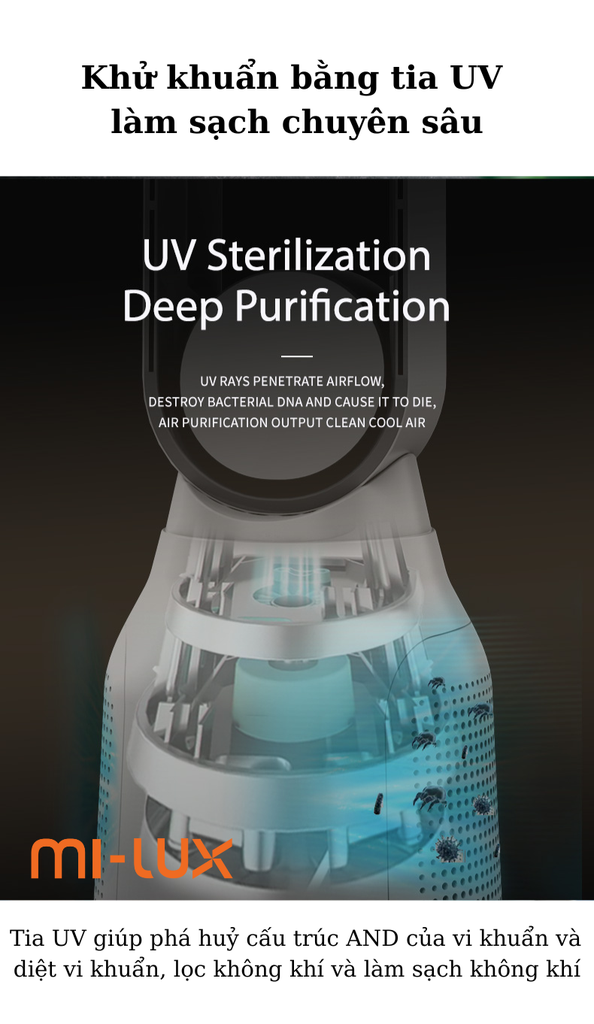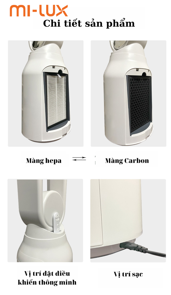 Quạt không cánh Mi-Lux A4 Pro tạo ion âm khử mùi, bộ lọc Hepa thanh lọc không khí, bộ lọc Carbon khử mùi, đèn UV diệt khuẩn giúp không khí trong lành, an toàn, hiệu quả