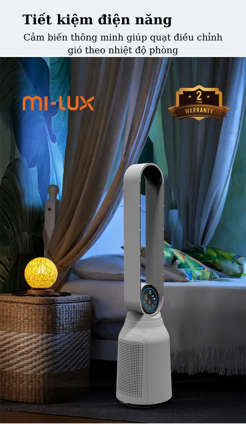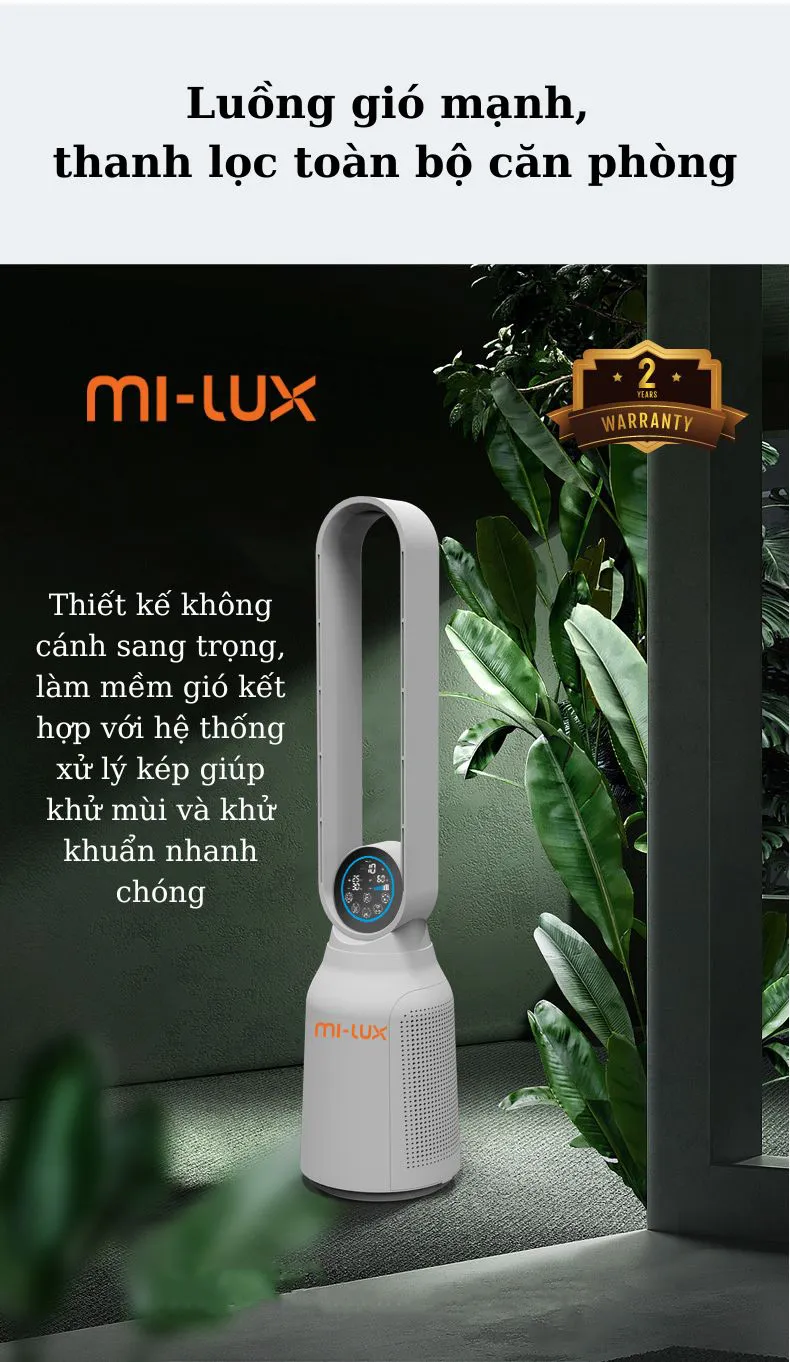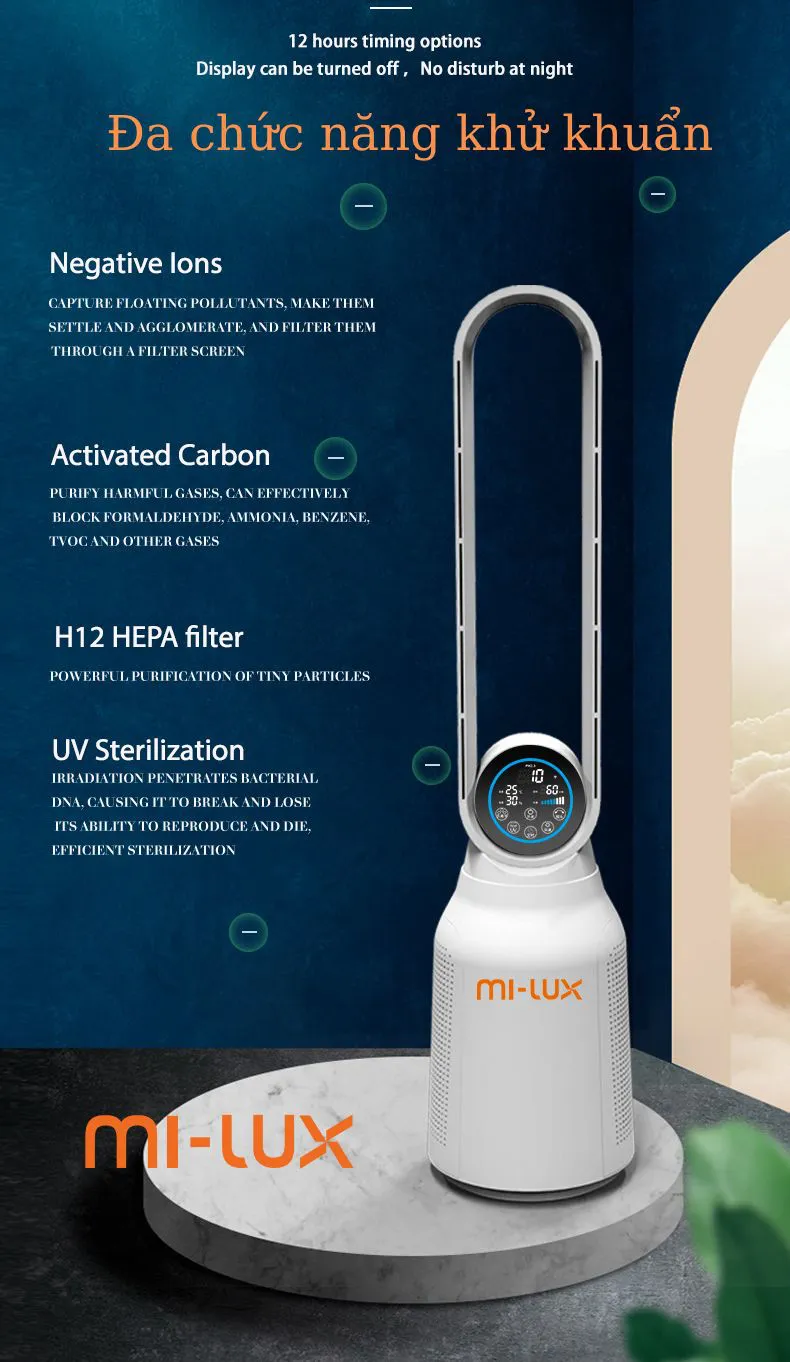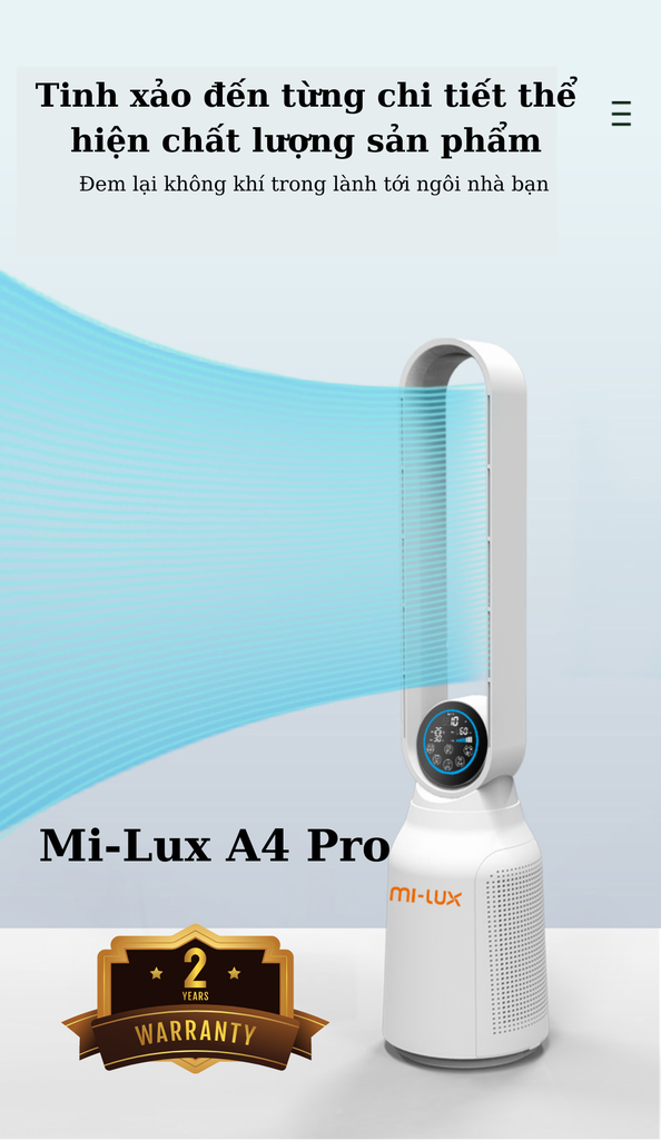 Mi-Lux Đồ gia dụng thông minh cao cấp cho ra mắt sản phẩm Quạt không cánh Mi-Lux A4 Pro với nhiều tính năng đặc biệt giúp người dùng trài nhiệm sản phẩm vượt trội hơn so với các sản phẩm trên thị trường bời những tính năng: Quạt không cánh, Lọc không bụi mịn 2.5pm, đèn led thông báo chất lượng không khí, màng lọc carbon cao cấp, tạo ion khử mùi, đèn uv diệt khuẩn đem lại luồng không khí trong lành bảo vệ an toàn tới sức khoẻ của bạn và gia đình.