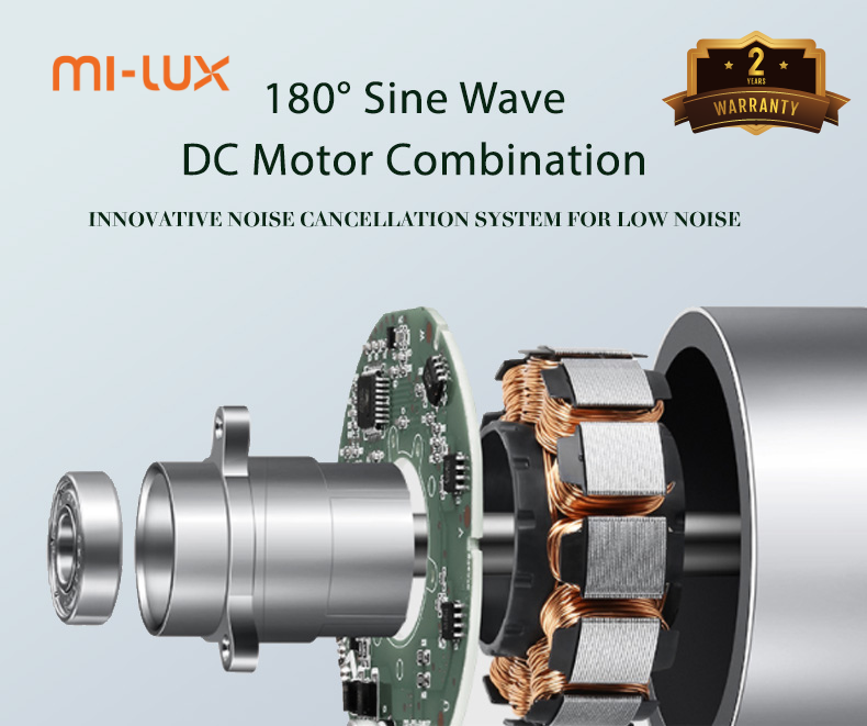 Quạt không cánh Mi-Lux A4 Pro sử dụng động cơ DC không chổi than mạnh mẽ cho lưu lượng gió có thể đạt đến 1100 lít/giây, đi kèm 12 cấp đô gió, cho khả năng tùy chỉnh tối ưu theo từng mục đích sử dụng của người dùng. Động cơ DC được thiết kế theo dạng hình sóng sin 360°, kết hợp với bộ giảm âm hai lớp, giúp máy hoạt động êm ái với tiếng ồn thấp chỉ 14.8dB, tạo sự thoải mái cho người dùng nhất là khi sử dụng quạt trong phòng ngủ.